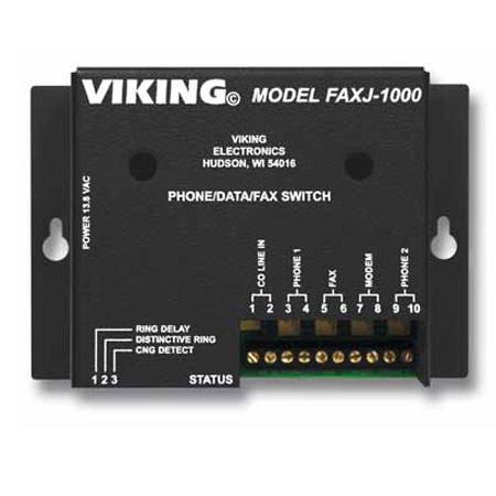 The Viking FAXJ-1000 allows any business, large or small, to enjoy the convenience of automated data transmission without the perpetual monthly expense of a dedicated phone line. The FAXJ-1000 is a versatile phone/data/fax switch with the ability to automatically route calls via fax CNG tone, central office distinctive ring, or touch tones included in the dial string by the calling party. In addition, the FAXJ-1000 offers full manual transfer capabilities. The FAXJ-1000 stores and retransmits caller ID information so that it is truly caller ID compatible.