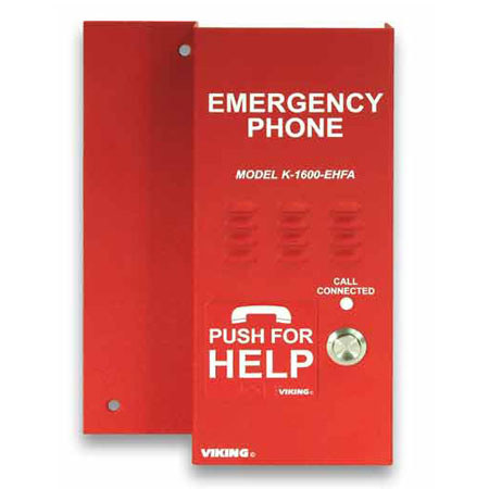 The Viking K-1600EHFA Elevator Phone Box Mount is designed to provide quick and reliable handsfree communication for any standard analog telephone line or analog phone system station port. The Viking K-1600EHFA phone meet ADA requirements for elevator/ emergency telephones and can be programmed from any Touch Tone phone. The phones can dial up to 5 programmable emergency numbers, as well as 2 central station numbers.