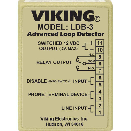 The Viking LDB-3 Advanced Loop Detector monitors an analog phone line for ringing or an off hook condition. A built-in relay can be activated when either of these conditions are detected. This is ideal for monitoring line status or for providing a visual indication of such. The LDB-3 disable input is ideal for two-button emergency phones, such as Viking E-1600-20A, allowing "Info" button calls to be placed without activating the relay (turning on the emergency strobe light, camera, etc.). Three DIP switches are provided for turning ring detection on or off, off-hook loop detection on or off and for selecting a ring cadence mode which allows the relay to follow ringing or to remain activated during the off time of standard ring cadence. The LDB-3 comes complete with a 12 VDC power adapter and can also provide switched 12VDC .35 Amp output to power external lights, etc. during ringing and/or off-hook conditions.