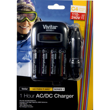 The Vivitar VIV-BC-491 battery charger can be used with AA (LR6) rechargeable batteries. The charger can hold up to 4 batteries and has a charge time of 1 hour. Includes mains and in-car charger.