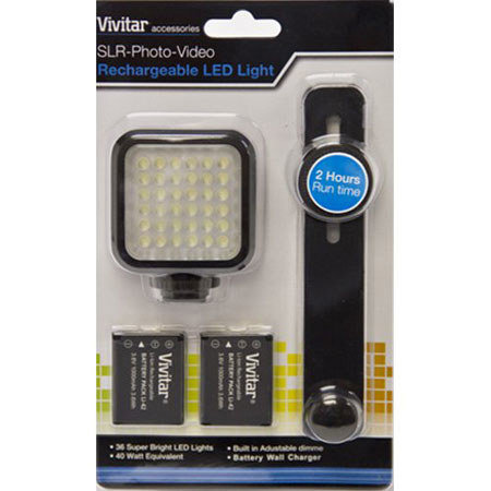 The Vivitar SLR/Photo/Video Rechargeable LED Light puts out the equivalent of 40 Watts of lighting. It has a slim design with consistent illumination and a built-in adjustable dimmer. It has a hot shoe mount for use with all camcorders, cameras, or brackets and allows up to 2 hours of continuous use.