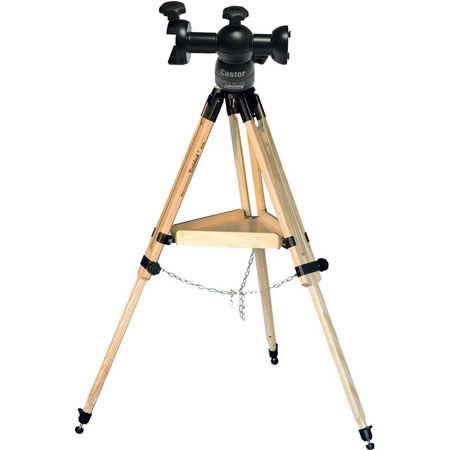 The Dual Castor Head on Wood Tripod is made of sold aluminum and the black coloris anodized, not painted on like other lower quality product. It has the option of accepting a second dovetail head or counterweight bar. The Report tripod is made from quality Ash wood and comes with a matching tray. It has rated capacity of 65lbs. Leg spread is adjustable from 20 deg to 45 deg. Tripod includes wood tray.