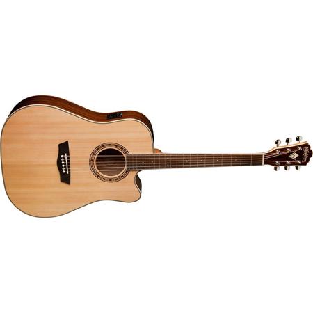 The WD10SCE features class leading tone, materials and cosmetics. High grade solid Sitka spruce is used for the soundboard and scalloped-bracing, paired with mahogany back and sides; in conjunction with a genuine bone nut and saddle, the Heritage 10 Series produces a rich and focused voice. In the Heritage 10 Series, the player also enjoys class leading cosmetics such as an ABS ivory fully bound body, inlaid wood rosette and pearl Washburn logo.