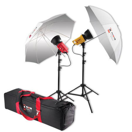 The light stands rise to a maximum height of 7.5 feet. The included 45" silver umbrellas soften the light, with a slight specular highlight. This kit includes a soft carry case and an instruction booklet