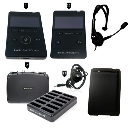 The Digi-Wave TGS 23 400 Series Tour Guide System is a digital spread-spectrum (DSS) technology that provides a secure and interference-free method of wireless communication. It includes the DLT 400 Transceiver, 23 DLR 400 RCH Receivers, and the MIC 144 Headset Microphone.