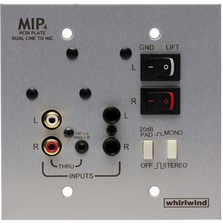 The Whirlwind MIP4 2-Gang Media Input Stainless Steel Plate is perfect for interfacing the outputs of CD players, computer sound cards, iPods / MP3 players, tape decks, etc. with professional, balanced, low impedance equipment. This unit contains two separate DIs - input your signals with one 3.5mm (1/8") mini TRS stereo jack, color coded RCA phono jacks or 1/4" TS input jacks. The RCA and 3.5 mm jacks are wired in parallel if a through connection is required. Outputs are on the rear via 3.5 mm screw type removable plugs (Phoenix 1984329 or equivalent).