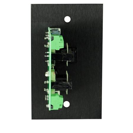 The MIP5 is a stereo line balancing plate. Stereo inputs can be connected to the 3.5mm TRS jack (tip is left, ring is right) or the RCA jacks. Two balancing transformers are provided, one for each channel. Output connections are made via individual 3 pin pluggable screw terminals. A Stereo/Mono switch is provided which combines left and right together and feeds the summed mono signal to both outputs. A Ground Lift switch breaks the ground connection between the inputs and the output screw terminals. Insertion loss is approximately 1.2 dB for stereo inputs, 1.7 dB for summed inputs and 7.7 dB for a single mono source, measured into a 2 kOhm load.