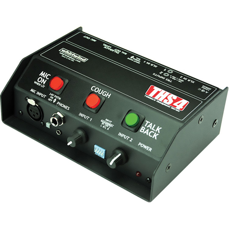 The THS 4's latching Mic On/Off switch connects signal to the main mic output and is illuminated red when live. The console also offers 36 Volt phantom power for condenser mics, with a recessed switch to prevent accidental deactivation. The Cough switch momentarily silences both the mic out and the talkback out, while the Talkback switch connects audio to the talkback output and mutes the mic out, illuminating green when activated.