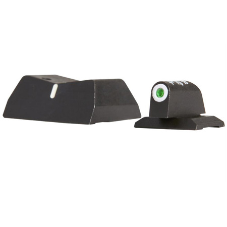 The set features a tritium green dot front sight and a white vertical line rear sight, ensuring optimal visibility and precision. The tritium inserts are encircled by a slim white line, further enhancing their visibility during daylight. For those seeking a more prominent view, the Big Dot versions come with a larger white outline surrounding the tritium insert, offering a more substantial sighting picture.