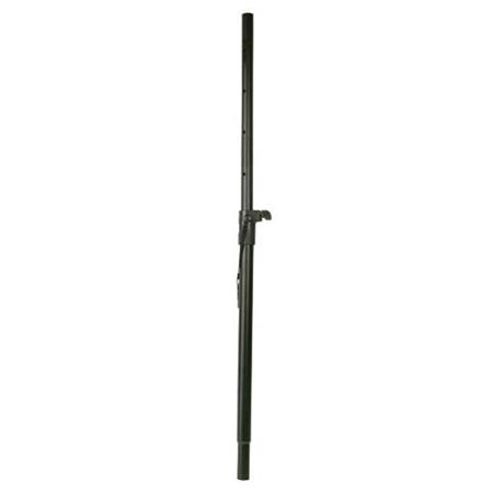 Adjustable length speaker support made specifically for mounting a full-range loudspeaker above a subwoofer. Height adjustment range from 26" to 37". A safety pull pin is also included for extra security. The weight of the speaker drives a spring-loaded mandrel against 3 pressure pads, essentially filling the gap between the pole and the speaker mount. The result is a straight, steady speaker system with a professional look. The extension can be removed for use with shallow subwoofer mounts from other manufacturers.