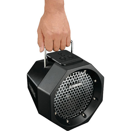 The Yamaha PDX-B11 has a durable octagonal body, a chrome-finished grille and silicone button covers to keep out dust. It's great for taking on-the-go because you can power it by AC or batteries. Plus it has a convenient built-in carrying handle. All in all, this speaker offers wireless convenience, superb sound quality and maximum portability.